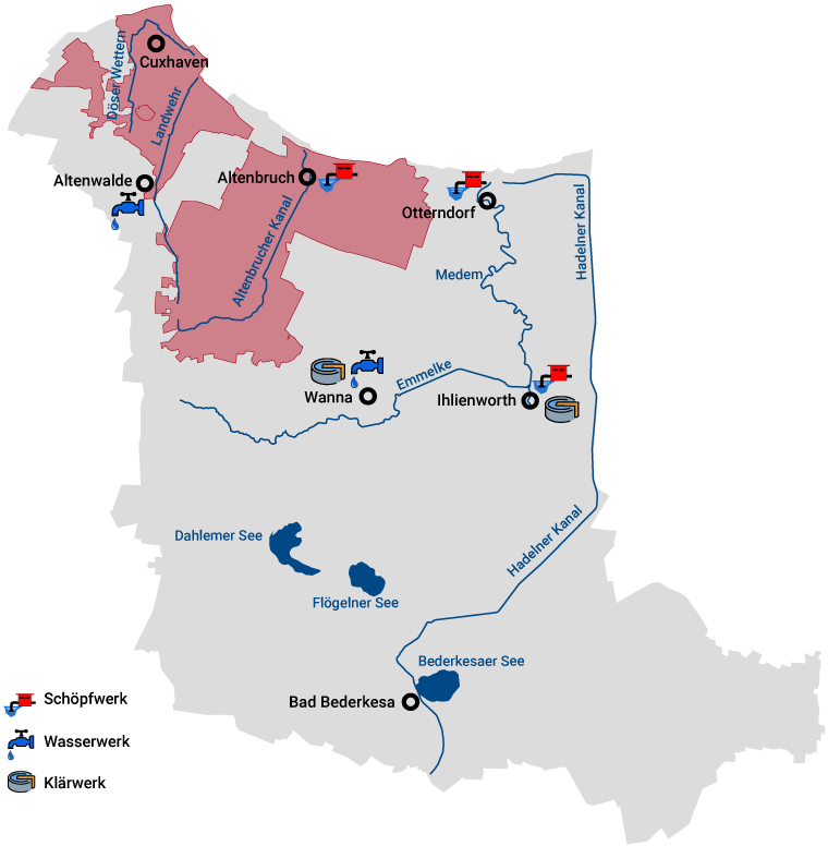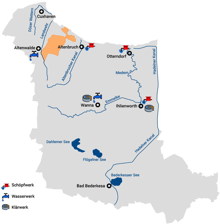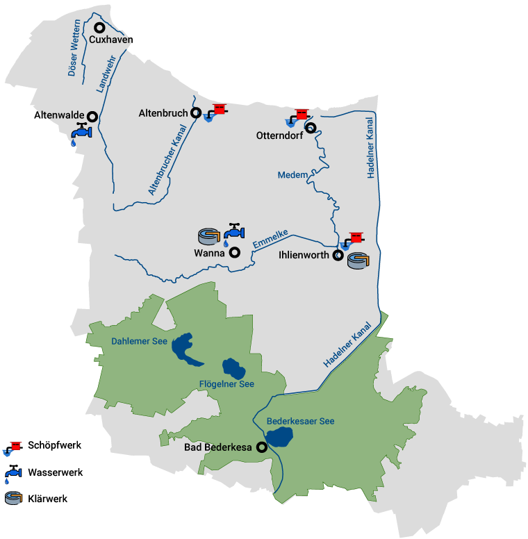 Die folgende Karte (grau dargestellt) zeigt den Grenzverlauf des Unterhaltungsverbands Land Hadeln.